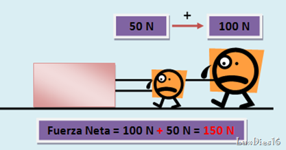 En la siguiente imagen se aplican fuerzas en la misma dirección, por lo tanto las dos tienen el signo positivo y sin ningún problema se suman las fuerzas para obtener la fuerza neta. En este caso a fuerza neta es de 150 N